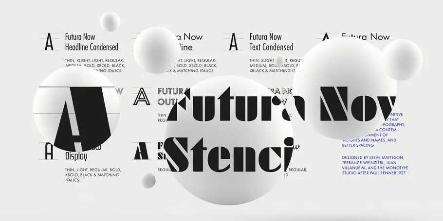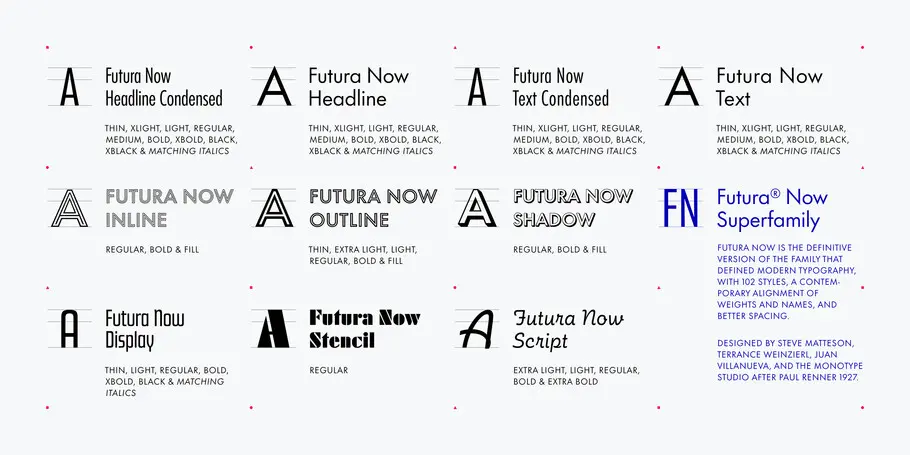 Futura Now Variable, with billions of weights and styles, is different than any Futura ever created. It expands the design range of the family exponentially, while shrinking its digital footprint.