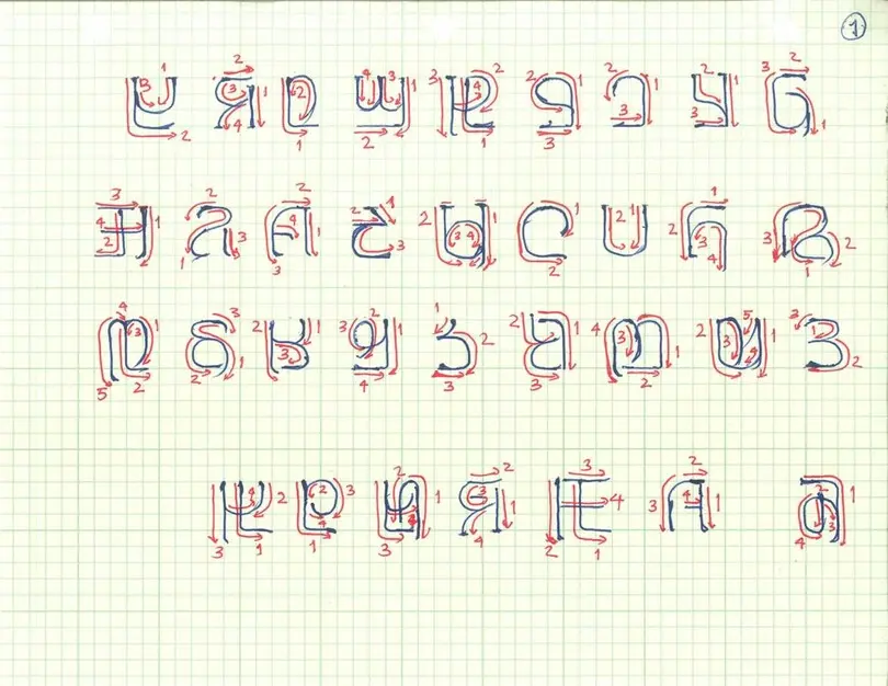 Monotypeにおける100年以上の歴史の中で初めて扱うアドラム文字では、書体デザイナーとスクリプトの発明者が直接タッグを組みました。これは、アドラム文字での初期段階のスケッチです。