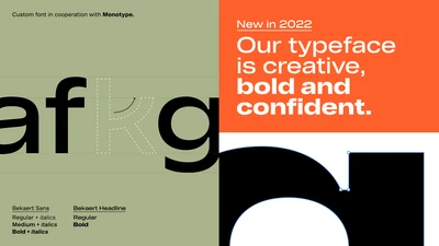 Monotypeは、鋼線の加工およびコーティング技術において世界をリードするBekaertのために、2種類のカスタム書体をデザインしました。大胆で現代的なこのデザインは、同社の長い歴史と産業的な遺産を表現しています。この書体は、Interbrandが主導するBekaertの全社的なリブランディングの中核を成しており、「安全、スマート、サステナブル」という価値のもと、私たちの暮らしと移動のあり方を形づくるリーディングパートナーを目指す同社のビジョンを支えるために設計されました。