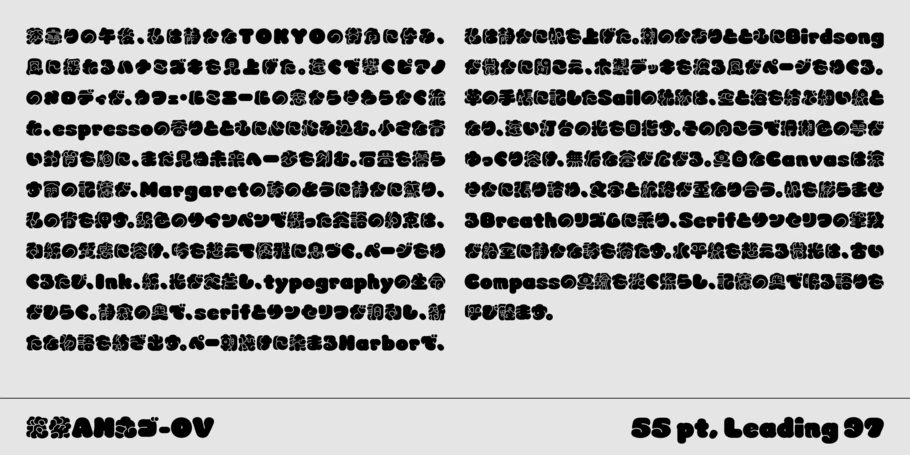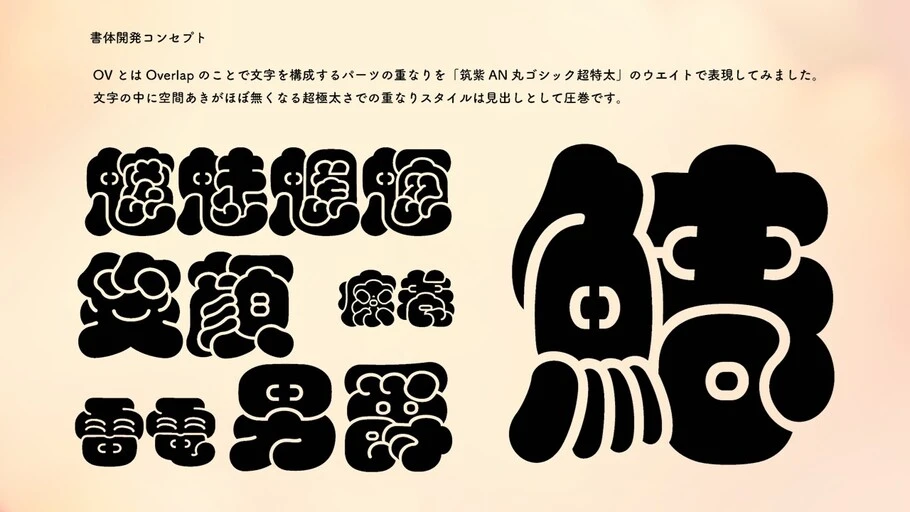 「Overlap」の頭文字を冠した「OV」は、文字を構成するパーツ同士の重なりを大胆に可視化し、Ultra ウェイトによってその存在感を最大限に引き出しています。筑紫AN丸ゴの「AN」は「アンティーク」を意味し、レトロな風合いと現代的な骨格を併せ持つデザインが特徴です。